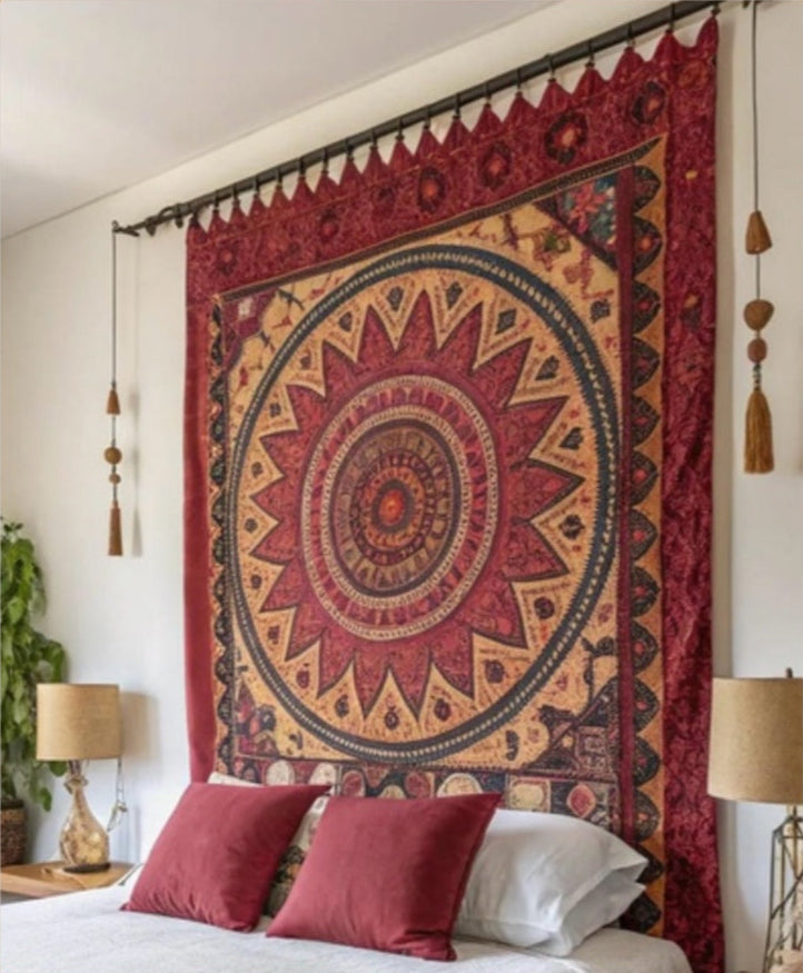 Crafted with precision, this hand-printed tapestry features intricate designs created using time-honored printing techniques. Its rich textures and detailed patterns bring an authentic, artisanal quality to your decor, making it a sophisticated focal point. Suitable for wall display or draping, this tapestry combines aesthetic elegance with versatile use, enhancing any environment with a touch of cultural artistry.